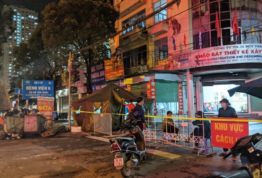 "Xóm ung thư" - nơi nhiều người bệnh ung thư thuê trọ trong khu dân cư đối diện Bệnh viện K cơ sở Tân Triều bị phong tỏa, tối 11/5. (Ảnh: CTV/Trí Thức VN)