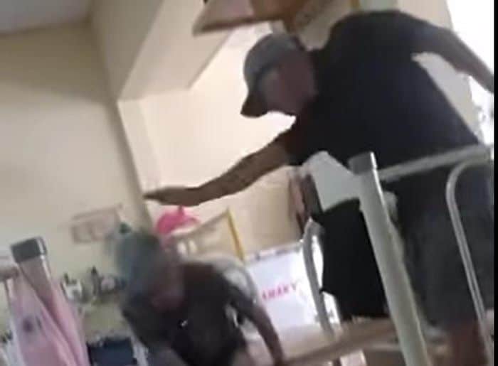 Clip lan truyền trên mạng cho thấy người đàn ông dùng tay đánh một cụ bà. (Ảnh: Chụp màn hình video/Hưng Hà/Facebook)