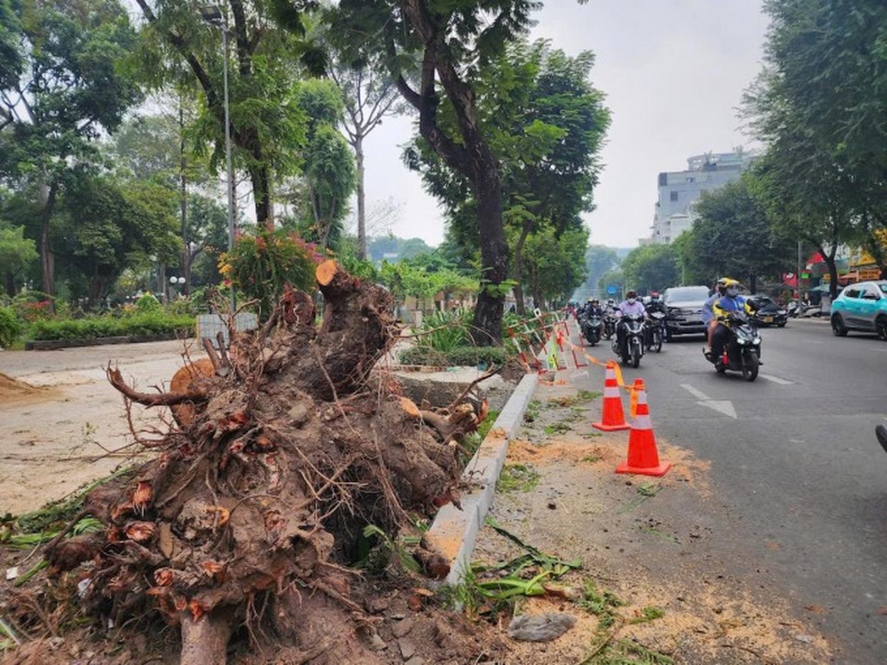 Quá trình thi công cải tạo vỉa hè khiến nhiều cây xanh ở trung tâm TP.HCM bị đứt rễ, phải đốn hạ hoặc cắt gọn phần tán để bảo đảm an toàn.
