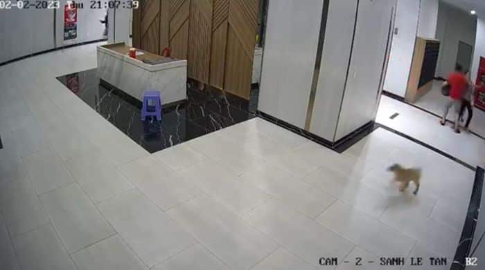 Lúc này, con chó của ông Đào Thế Vinh (SN 1995, ngụ cùng chung cư) không xích, không rọ mõm, đi từ thang máy ra và tiến đến gần con trai ông D.