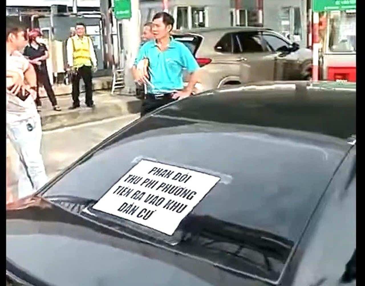 Không chỉ có các tài xế, nhiều người dân cũng kéo nhau ra khu vực thu phí, xếp hàng, mặc đồng phục và cầm khẩu hiệu phản đối việc thu phí.