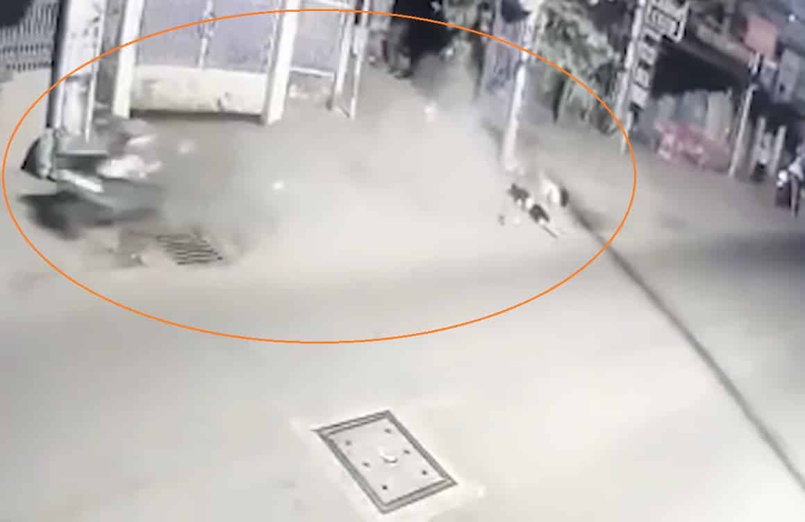 Cảnh nghi phạm Nguyễn Thanh Huy đạp vào xe máy của anh N. khiến hai người trên xe văng đập vào cột điện, cùng tử vong, tối 3/2/2022. (Nguồn: Công an cung cấp/nld.com.vn)