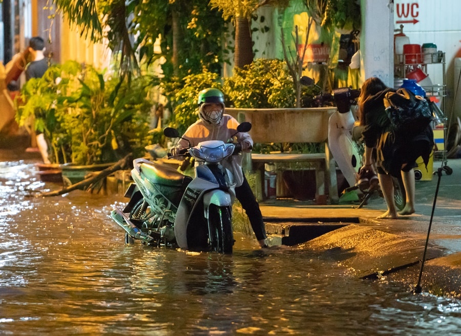 Nước lênh láng không biết chỗ nào có ổ gà, ổ voi mà tránh. Dắt xe trở thành cách duy nhất để về nhà an toàn.Nhiều người phải bật đèn để dắt xe thoát khỏi chỗ ngập sâu.Người dân cho biết vào tháng 9-10 hàng năm, nước đều ngập do triều cường và mưa lớn. Tuy nhiên, càng lúc càng nhiều khu vực bị ngập, mức ngập cao hơn và lâu rút hơn.Trong các con hẻm không phải chịu cảnh giao thông bị ùn ứ, song nhiều người phải dắt xe đến tận cửa nhà do đâu đâu cũng ngập.Nước bẩn, thối khiến nhiều người bị nổi mẩn. Rác thải hòa lẫn trong nước thải sinh hoạt từ các cống dâng lên khiến cho ô nhiễm lây lan diện rộng.Đài khí tượng thủy văn khu vực Nam Bộ dự báo trong 2 ngày 30/9-1/10, triều cường đạt đỉnh, từ 1,68 – 1,7 m tại các trạm Phú An và Nhà Bè, cao hơn mức báo động 3 từ 0,15-0,2 m. Thời gian xuất hiện đỉnh triều 5-7h và 16-18h.