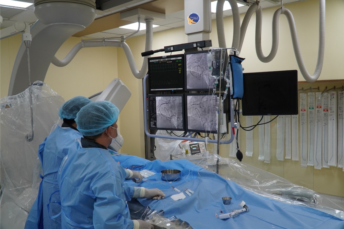 Bà P.T.B. (60 tuổi, ngụ Tây Ninh) nhập viện khoảng 9h12 sau cơn đau ngực dữ dội, khó thở và vã mồ hôi lạnh khi đang tập thể dục. Kết quả chụp mạch vành cho thấy tắc hoàn toàn đoạn gần động mạch vành phải (RCA), kèm hẹp đoạn giữa động mạch liên thất trước (LAD). Ê-kíp tiến hành nong mạch và đặt stent, tái thông dòng máu kịp thời, giúp bệnh nhân ổn định.