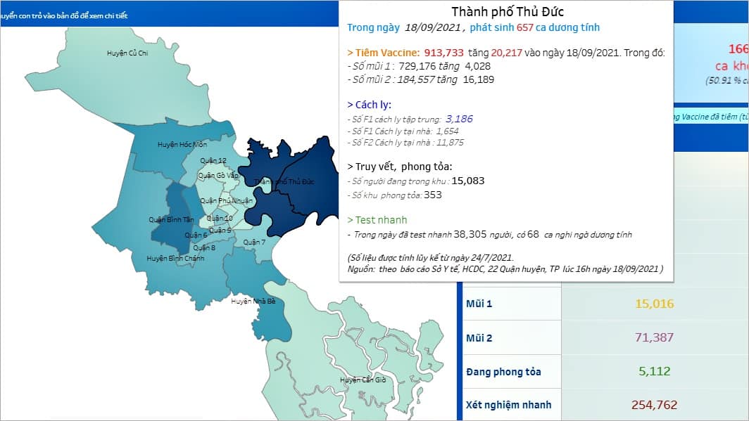 TP Thủ Đức từ 29-4 đến 18/9 ghi nhận hơn 25,3 nghìn ca COVID-19. Cao nhất là quận Bình Tân với hơn 25,8 nghìn ca. (Nguồn: covid19.hochiminhcity.gov.vn)