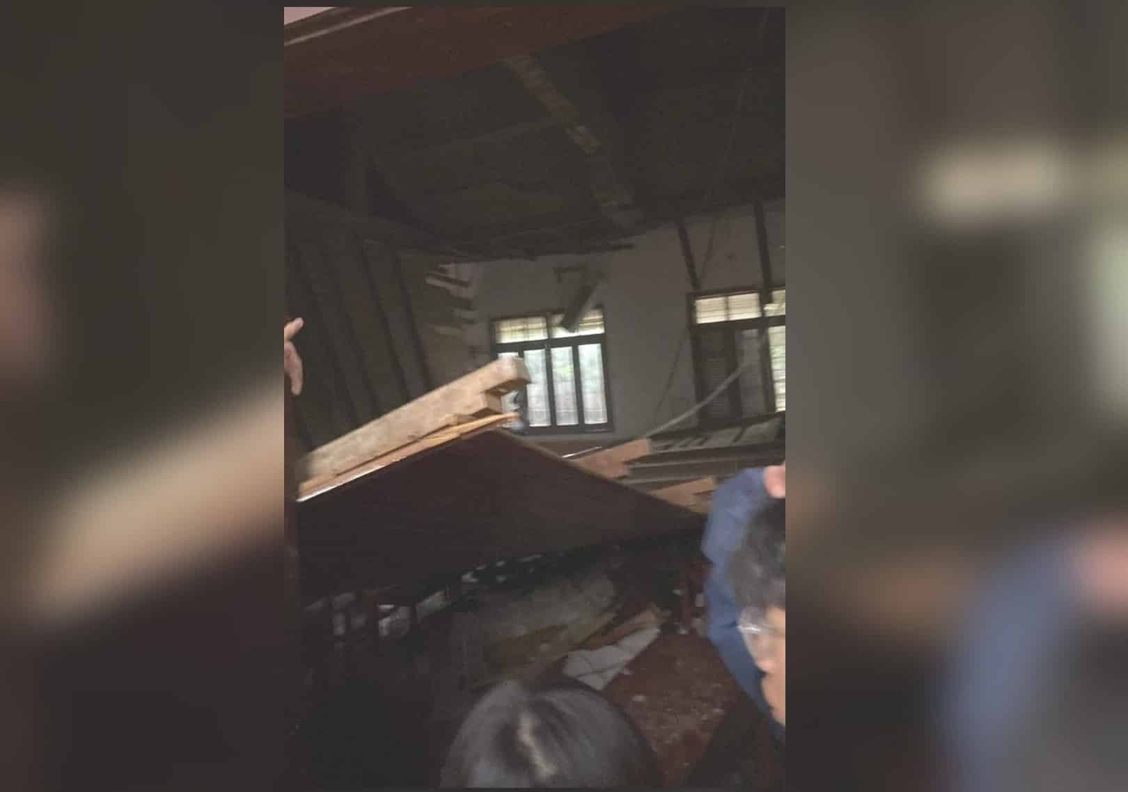 Hình ảnh được chụp tại hiện trường cho thấy phần lớn trần nhà bằng gỗ sập, một phần đổ xuống bàn học, một phần còn dính trên tường (gồm cả quạt trần). Ngoài phần trần gỗ, nhiều tảng bê tông lớn rơi xuống. Lớp học ngổn ngang gỗ, bê tông, xi măng, dây điện…