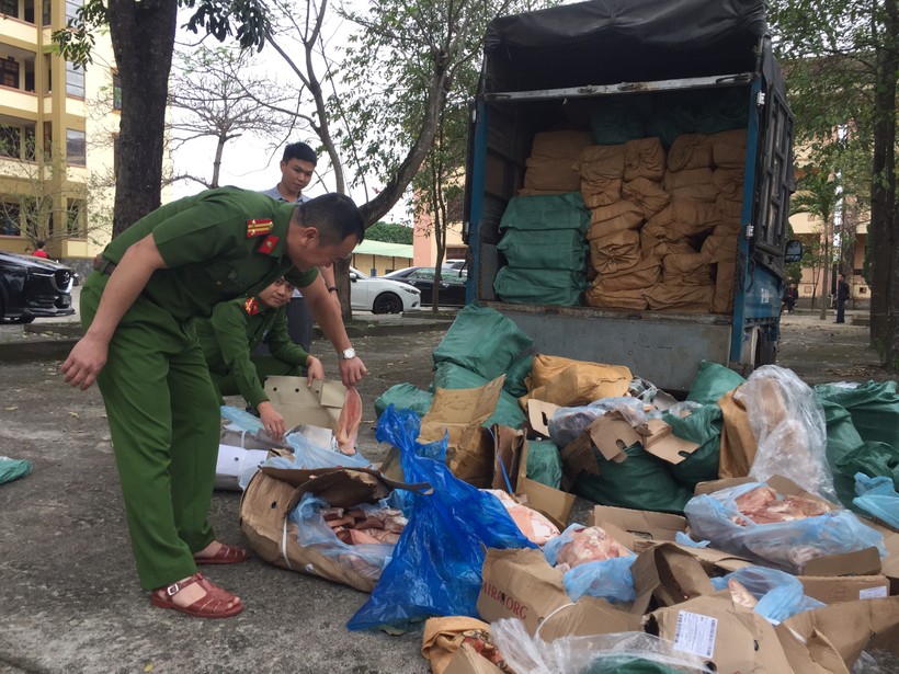Qua kiểm tra, cơ quan chức năng phát hiện trên xe vận chuyển 172 bao tải, bên trong chứa 5,9 tấn sản phẩm từ động vật. Trong đó bao gồm: 80 bao lưỡi heo, 20 bao tai heo, 10 bao thịt nạc heo, 23 bao da heo, 10 bao chân gà, 15 bao thịt vụn, 15 bao nạm bò.