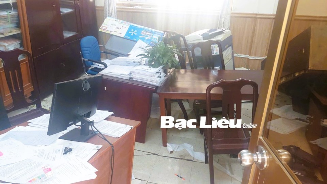 Tủ, bàn, ghế trong phòng làm việc của Sở Y tế Bạc Liêu bị xô đổ do nền nhà sụt lún mạnh. (Ảnh: N.Q/baobaclieu.vn)
