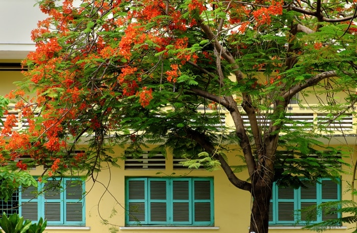 Tán phượng nở đỏ rực là một phần ký ức không thể thay thế của học sinh trong ngày tháng tới trường. Hình ảnh tại một ngôi trường ở TP.HCM. (Ảnh: xuanhuongho/Shutterstock)