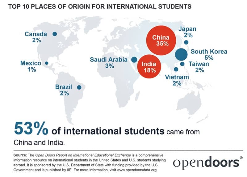 Trung Quốc đứng đầu nhóm 10 quốc gia, vùng lãnh thổ có số lượng du học sinh lớn nhất tại Mỹ, chiếm 34,6% tổng số du học sinh quốc tế. Tiếp đến là Ấn Độ (18%), Hàn Quốc (4,6%), Ả rập Saudi (2,9%), Canada (2,4%), Việt Nam (2,2%), Đài Loan (2,2%), Nhật Bản (1,6%), Brazil (1,6%), Mexico (1,3%).