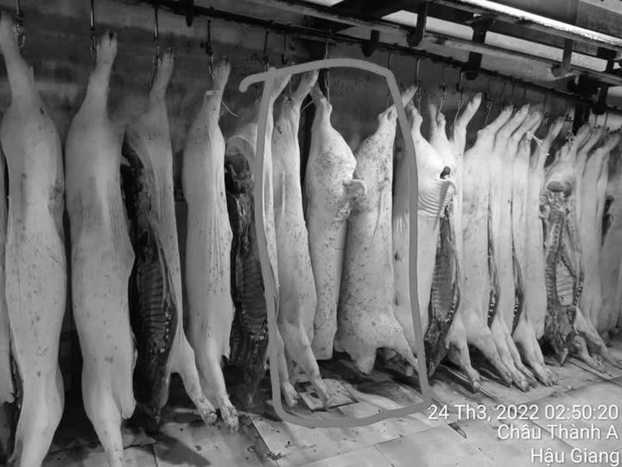 Hình ảnh cho thấy nhiều mảnh heo treo trên móc, trong đó 2-3 mảnh xuất hiện các đốm đỏ, được chủ tài khoản khoanh vùng để làm rõ. Thời gian ghi nhận hình ảnh được cho là 2h50 ngày 24/3/2022, tại huyện Châu Thành A, tỉnh Hậu Giang.