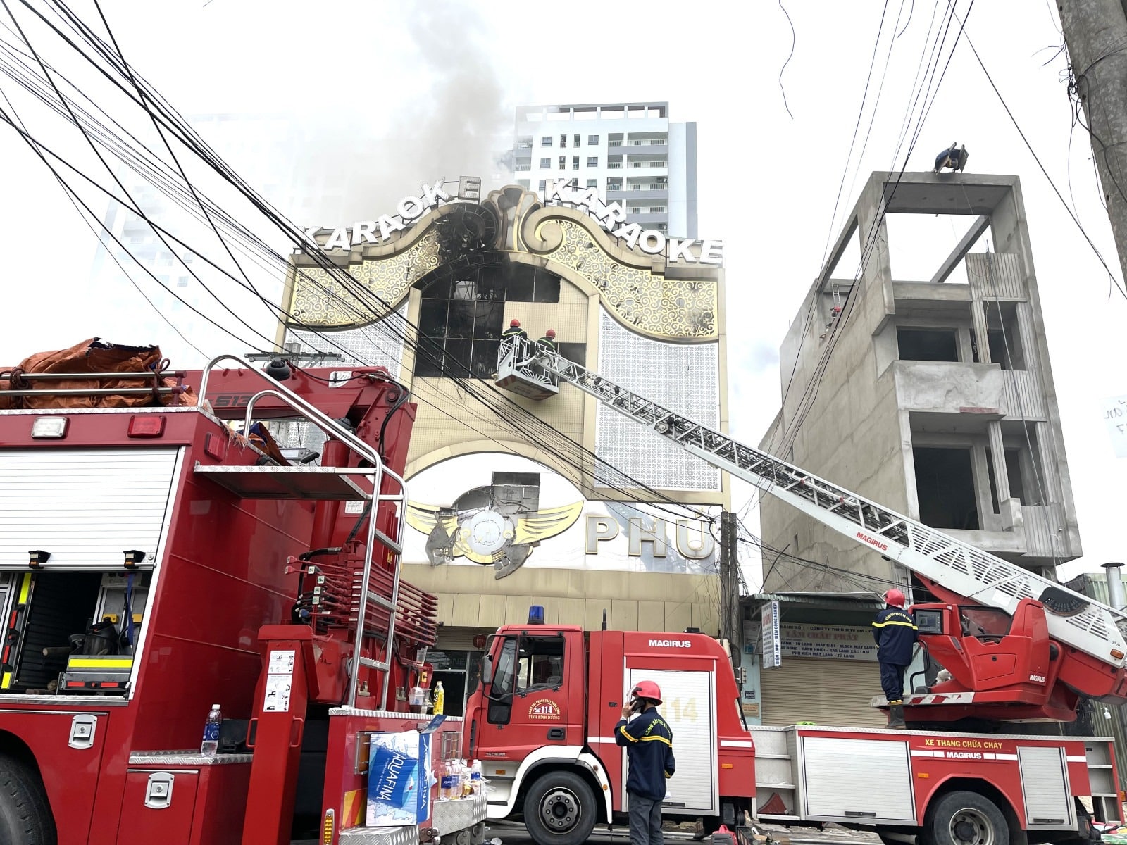 Một nguồn tin cho biết còn khoảng 2 phòng karaoke ở tầng lầu chưa được kiểm tra, cảnh sát đang cố đập tường tiếp cận từ hướng này. Từ phía nóc của quán karaoke, khói vẫn còn bốc lên ngùn ngụt.