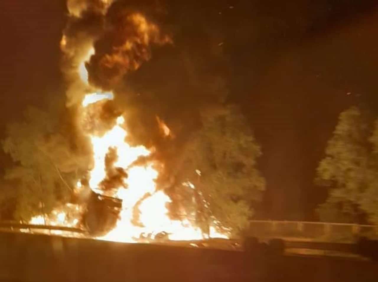 Cú va chạm mạnh khiến xe bồn lật ngang, bốc cháy dữ dội. Ngọn lửa bốc cao dữ dội, cháy lan sang hành lang cây xanh bên đường cao tốc. Khói đen đặc bao trùm. Một chiều đường ô tô cao tốc Hà Nội-Hải Phòng hoàn toàn bị chặn.