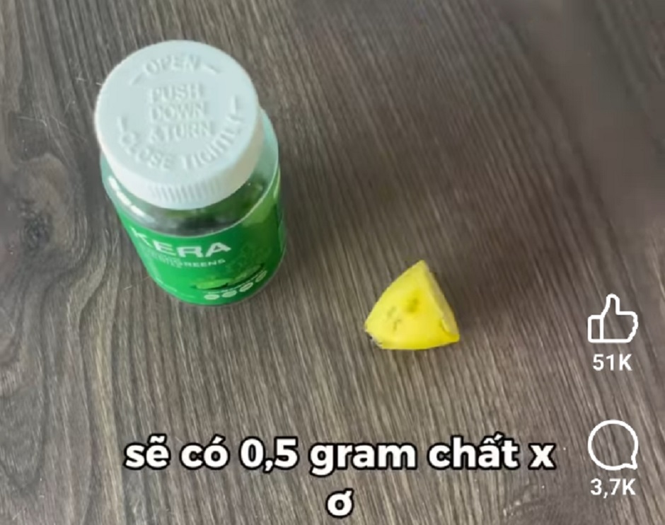 “Kể cả khi ăn hết cả hộp, sẽ có 0,5gr chất xơ, tương đương 1/6 quả chuối”, người này đưa ra thí dụ so sánh và đề nghị nhãn hàng hoặc người bán hàng đưa ra lời giải đáp, rằng với lượng chất xơ 0,016gr/viên thì tương đương với một đĩa rau như thế nào.
