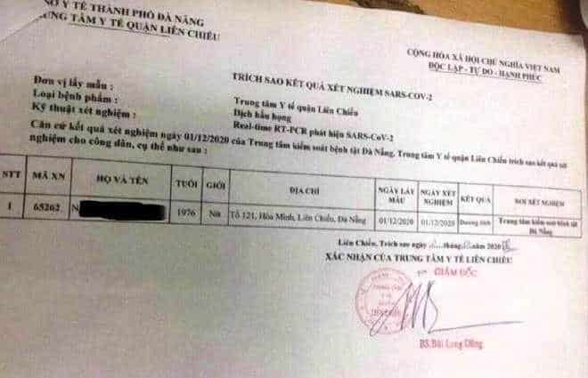 Giấy xét nghiệm này do Phó Giám đốc Trung tâm Y tế quận Liên Chiểu ký và đóng dấu, đơn vị thực hiện xét nghiệm là Trung tâm Kiểm soát bệnh tật TP. Đà Nẵng, nơi lấy mẫu là Trung tâm Y tế quận Liên Chiểu.