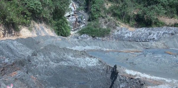 Khoảng 700m3 bùn thải quặng đã tràn từ trên núi xuống suối, Nậm Huống sau sự cố vỡ bể chứa đêm ngày 8 và sáng 9/3. (Ảnh: truyenhinhnghean.vn)