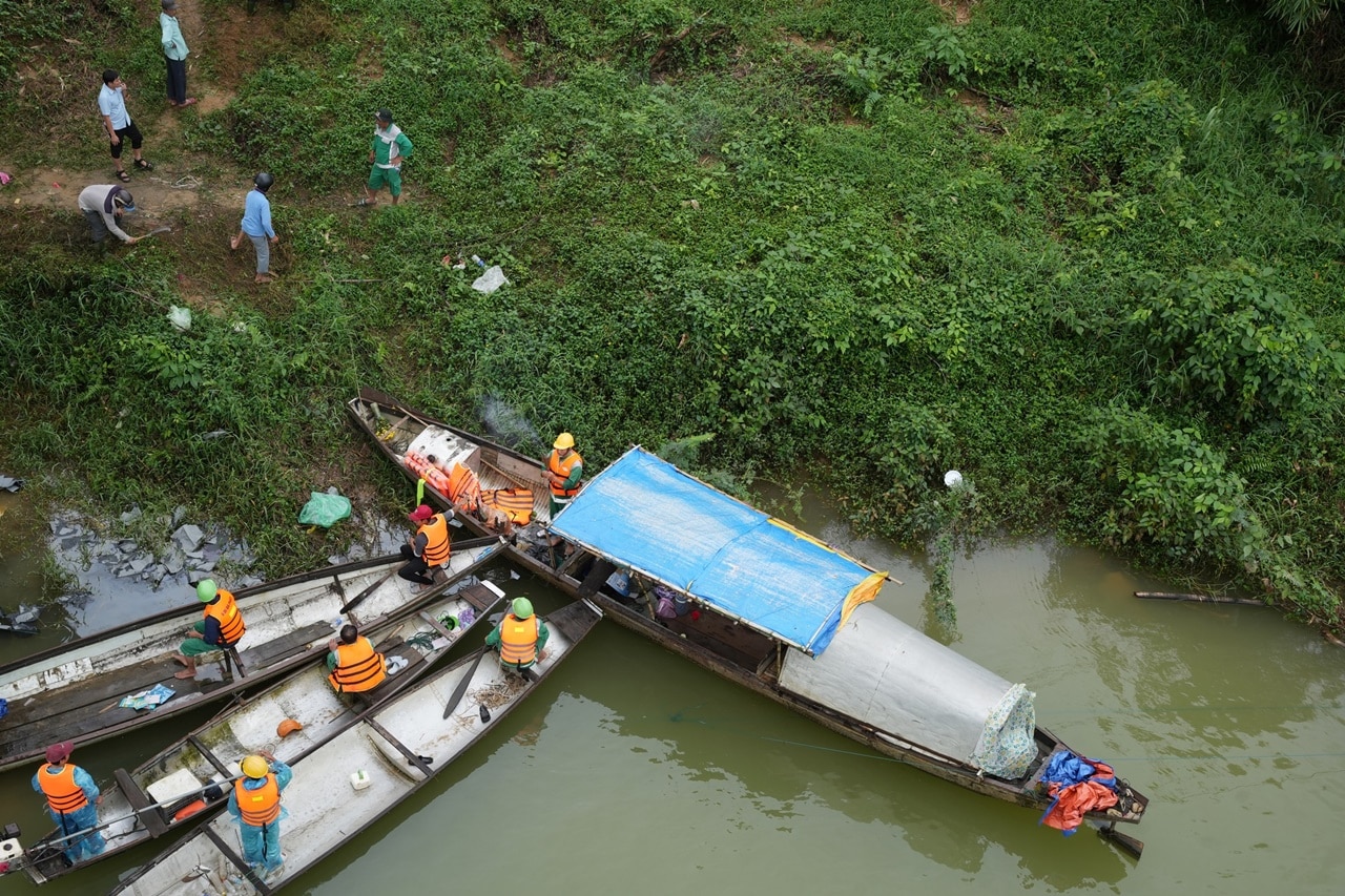 Sau hơn hai ngày gặp nạn, thi thể hai nạn nhân trên chiếc xe chở rác bị rơi khỏi cầu treo Bình Thành (tỉnh Thừa Thiên Huế) đã được đưa lên thuyền để vào bờ, đưa về nhà.