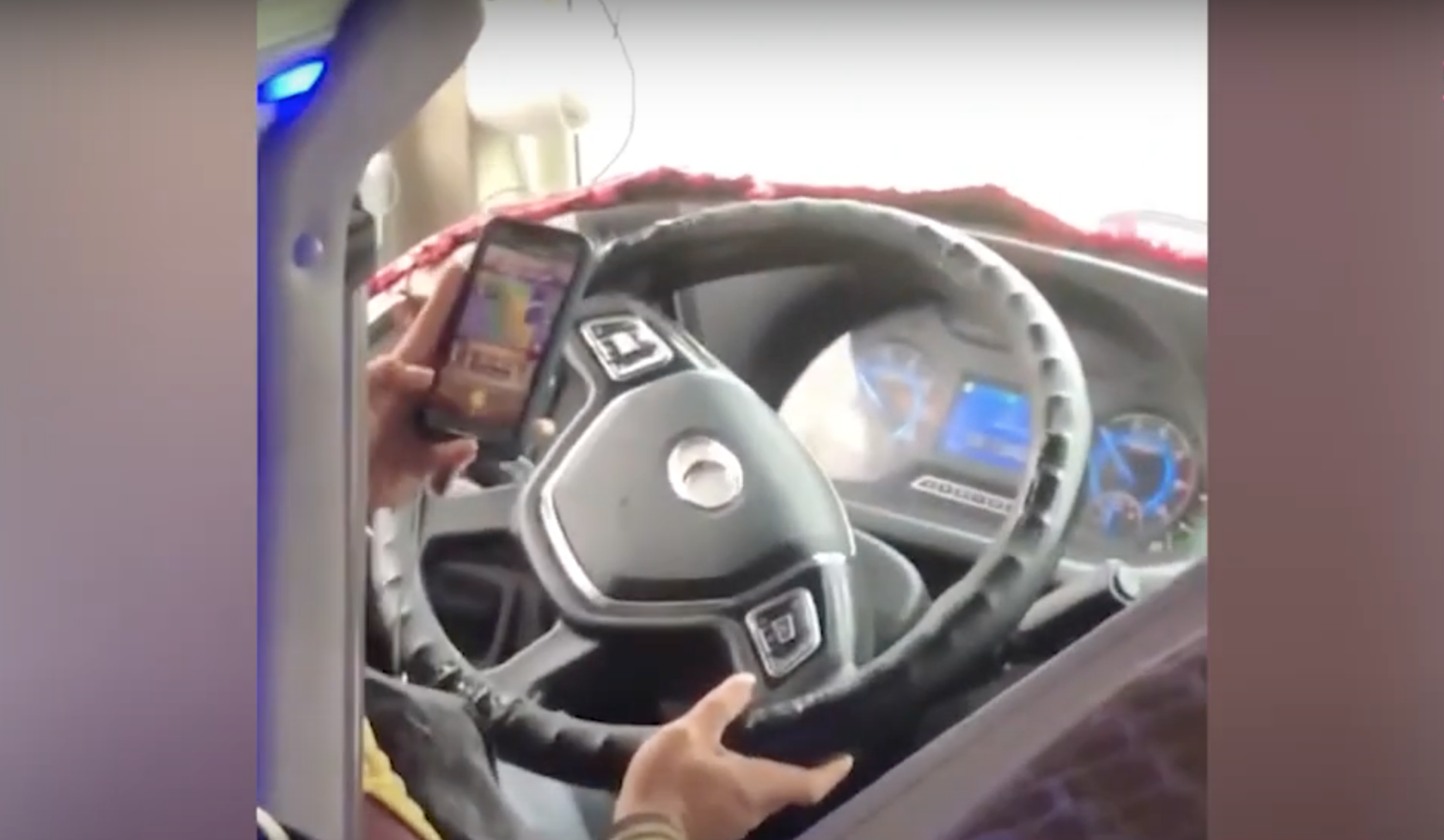Tài xế xe giường nằm vừa lái xe vừa chơi game. (Ảnh: Chụp màn hình/video/Nghệ An TV/YT)