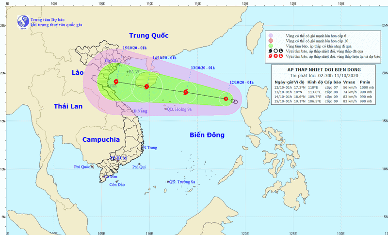 Theo Trung tâm dự báo Khí tượng Thủy văn Trung ương, vào 1 giờ sáng nay (ngày 12/10), vị trí tâm áp thấp nhiệt đới trên biển Đông, cách quần đảo Hoàng Sa khoảng 630km về phía Đông Đông Bắc. Sức gió mạnh nhất vùng gần tâm áp thấp nhiệt đới mạnh cấp 7 (50-60km/giờ), giật cấp 9. Bán kính gió mạnh từ cấp 6, giật từ cấp 8 trở lên khoảng 100km tính từ tâm áp thấp nhiệt đới.
