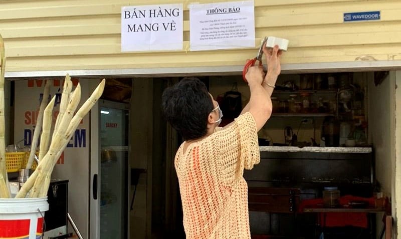 Một chủ hàng ăn uống tại quận Đống Đa dán thông báo chỉ bán mang về, ngày 13/12/2021. (Ảnh: hanoimoi.com.vn)