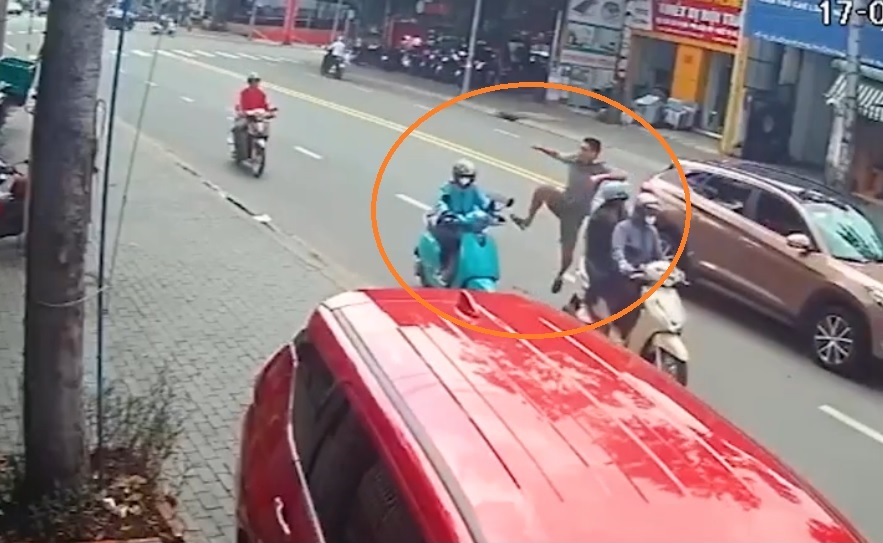 Đèn tín hiệu chuyển xanh, cả hai xe cùng qua giao lộ. Do vẫn bực tức nên khi vợ dừng xe, ông L. mở cửa xuống xe, đạp ngã nữ tài xế xe ôm vừa đi từ phía sau lên.