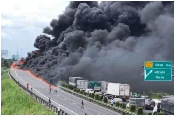 Một số tài xế đang chạy xe trên cao tốc cho biết phương tiện bốc cháy nghi chở một số thùng nhớt đã qua sử dụng. Dầu nhớt từ các thùng này tràn xuống đường khiến đám cháy bùng phát dữ dội.