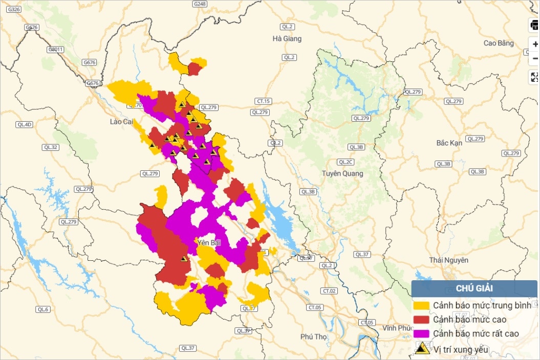 Trong đó, phía Đông tỉnh Lào Cai, và hầu như toàn bộ tỉnh Yên Bái nằm trong vùng cảnh báo, từ mức trung bình đến rất cao.