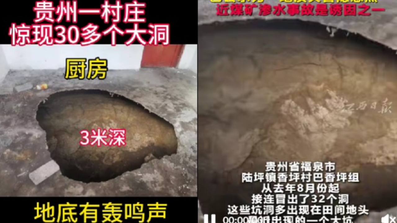 32 vụ sụt lún tại một ngôi làng ở Quý Châu, tiếng ầm ầm phát ra từ hố