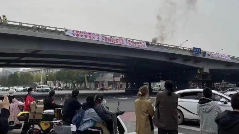 Theo đoạn video đăng tải trên mạng, trong lúc phía dưới cầu Tứ Thông ở Bắc Kinh là dòng xe chạy kín thì trên cầu bốc lên đám khói đen, đồng thời có một người đàn ông mặc áo đỏ mũ vàng dùng loa hô hào những câu phản đối như ghi trong biểu ngữ.