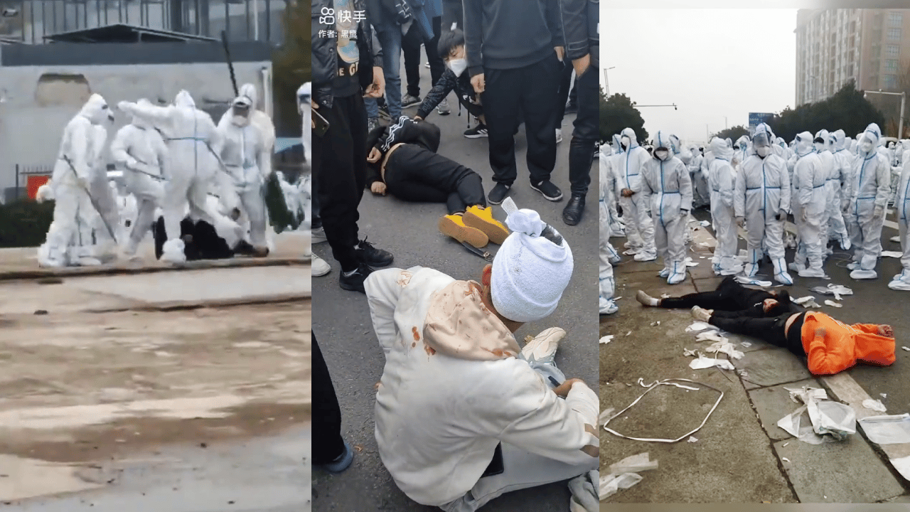 Trong video có thể thấy có nhân viên Foxconn bị thương ngồi bệt dưới đất, rất nhiều người đang bao quanh, có người hét lên: “Cảnh sát sẽ đánh chết tất cả các người!”. Có cư dân mạng hiểu tình hình cho biết rằng hơn 40 người đã bị bắt đi. Còn có cư dân mạng trút tức giận: “Còn tàn nhẫn hơn cả trên chiến trường Nga-Ucraina!”; “Những kẻ mặc áo choàng trắng là sứ giả của địa ngục…”; “Cái này là bạo tàn chuyên chế, bạo tàn chuyên chế nhân danh chống dịch bệnh!”