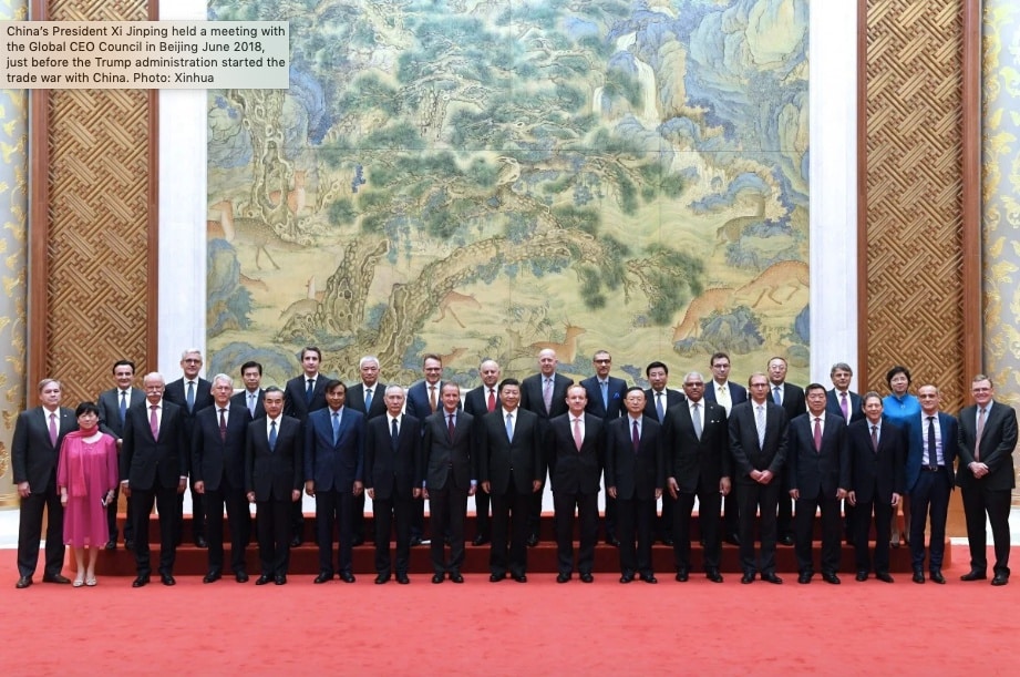 Ông Tập đã tổ chức một cuộc họp với các đại biểu của nhóm này tại Bắc Kinh vào tháng 6 năm 2018, ngay trước khi cuộc chiến thương mại Mỹ – Trung nổ ra. Trong cuộc họp này, các giám đốc điều hành người Mỹ đến từ những công ty như UPS, Pfizer, Cargill, Prologis và Goldman Sachs đã được ông Tập đề nghị giúp chống lại “chủ nghĩa bảo hộ.”