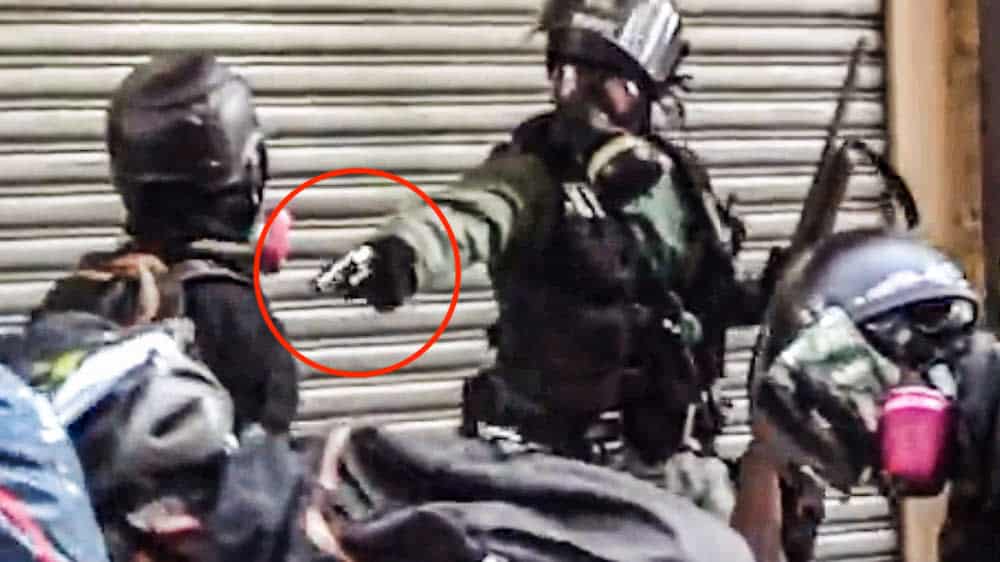 Từ một đoạn video được thành viên của Hội sinh viên Đại học Thành phố Hồng Kông đăng tải lên Facebook có thể thấy, trong lúc xung đột, một cảnh sát đã giơ súng đạn thật bắn vào người biểu tình, trong đó có một người biểu tình mặc áo đen dường như đã bị trúng đạn và ngã xuống đất, ngực bên trái có nhiều máu chảy ra, và liên tiếp kêu “đau quá”.