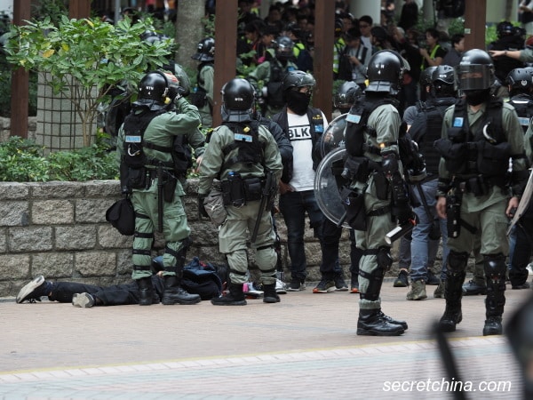 Nhiều cảnh sát chống bạo động Hồng Kông khống chế nhiều người trong đó có một người nữ giới, một thành viên đội Tốc Long đeo biển hiệu “CRT NTN DI O” cùng cảnh sát chống bạo động vung dùi cui trúng vào lưng của một nữ phóng viên Apple Daily, nữ phóng viên này hỏi cảnh sát vì sao đánh cô, lại bị cảnh sát quát mắng “chạy đi!” và tiếp tục mắng chửi nữ phóng viên này cũng như nhiều lần xô đẩy cô.