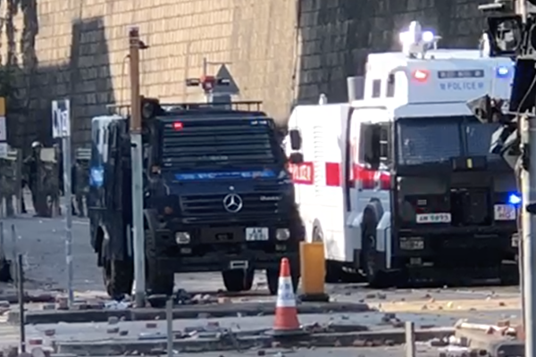 Người biểu tình một bên rút lui, một bên vẫn tiếp tục ném bom xăng khiến bánh xe của xe bọc thép bị cháy, xe bọc thép và xe bắn nước lùi lại. Hiện trường còn có một chiếc trực thăng bay lượn trên không.