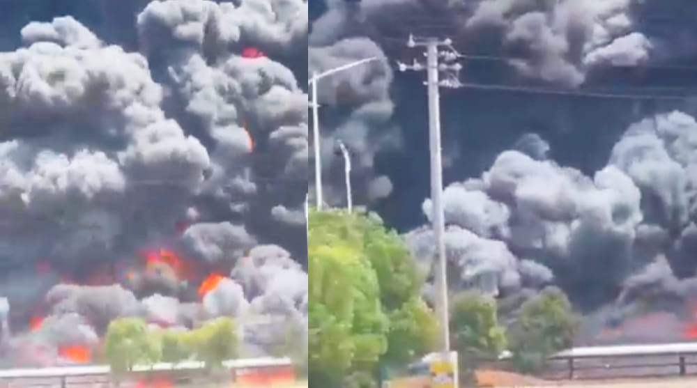 Trong các video được đăng trên mạng xã hội, có thể thấy khói từ vụ cháy nổ đã tạo thành một cột mây hình nấm khổng lồ có màu xám đen nồng đậm, hiện trường bị khói bao phủ dày đặc.