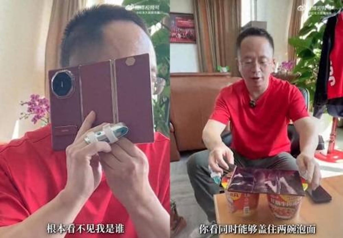 Ông cũng cho biết: “Khi bận rộn đi làm mà ăn mì ăn liền thì chức năng rất quan trọng của điện thoại di động là làm nắp đậy hộp mì. Nếu ăn 2 hộp mì ăn liền cùng lúc thì điện thoại của bạn khó có thể đậy 2 nắp mì ăn liền, chỉ có thể đậy từng hộp, từng hộp. Nhưng có Huawei Mate XT thì sẽ khác, cùng lúc có thể đậy được 2 hộp mì ăn liền, nên hiệu suất ăn mì ăn liền sẽ tăng gấp đôi, đậy bằng Mate XT sẽ càng chắc chắn hơn…”