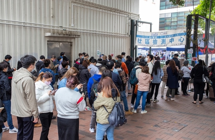 Ngày 09/2/2022, người dân Hồng Kông xếp hàng chờ xét nghiệm virus corona mới tại một trung tâm xét nghiệm COVID-19. (Ảnh: Yung Chi Wai Derek / Shutterstock).