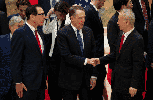 Bộ trưởng Tài chính Mỹ Steven Mnuchin (trái) và Đại diện Thương mại Mỹ Robert Lighthizer (giữa) cùng Phó Thủ tướng Trung Quốc Lưu Hạc (Ảnh từ Getty Images)