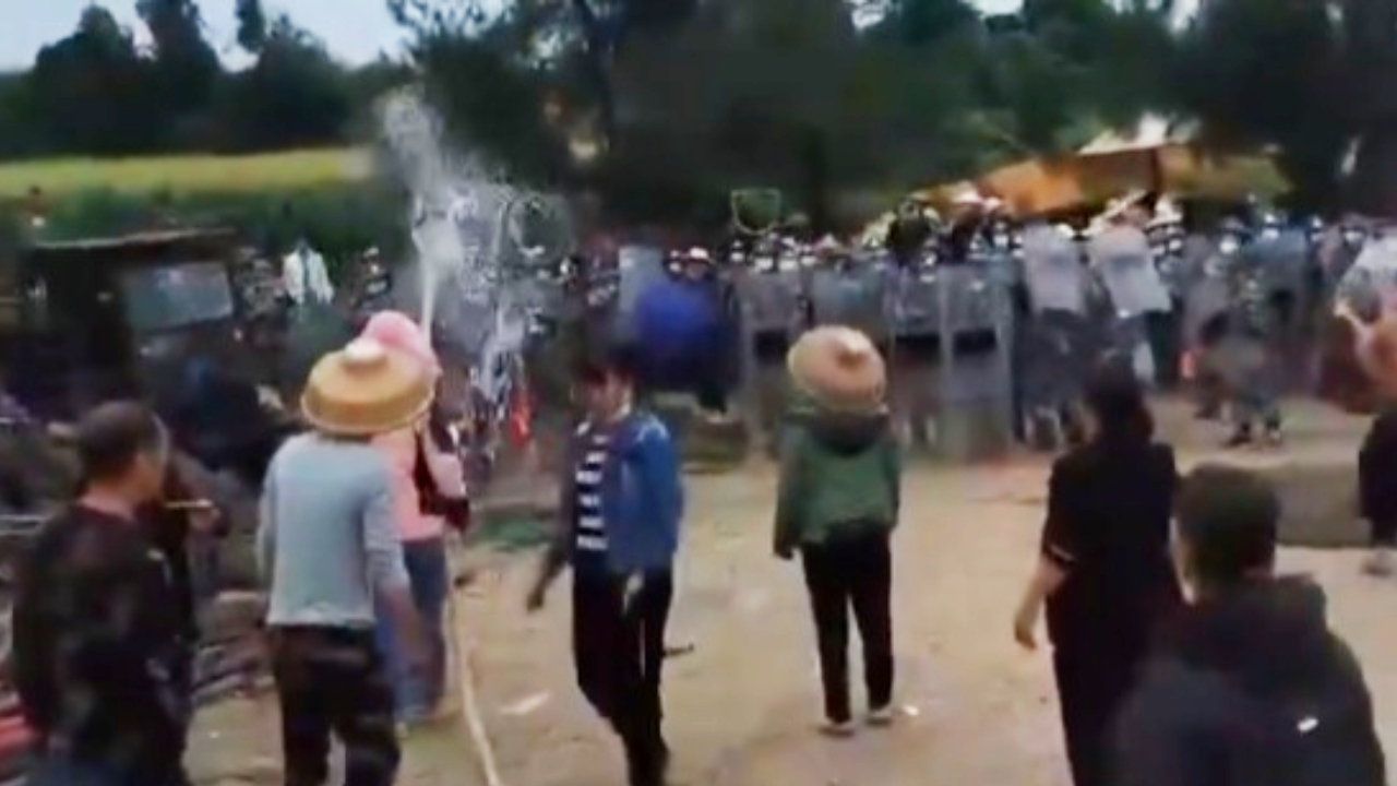 Một số người cầm ống xịt nước vào cảnh sát. Tại một bờ sông, nhiều cảnh sát bị dân làng tạt nước. Một số dân làng đuổi theo cảnh sát, tạt nước chống trả. Một số người còn ném những vật thể giống như sương mù màu trắng vào cảnh sát. Trên một con đường, rất nhiều xe cảnh sát xếp thành hàng dài hút tầm mắt.