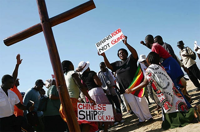 Năm 2008, các công đoàn, giáo hội và các nhà lãnh đạo nhân quyền ở các nước Nam Phi phản đối tàu chở vũ khí An Nhạc Giang (An Yue Jiang) của Trung Quốc đến khu vực Nam Phi (Ảnh: Getty Images)