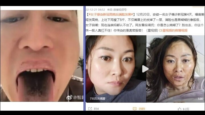 Sau khi người đàn ông Thiên Tân mắc COVID, ông phát hiện ra rằng lưỡi và răng của mình đã chuyển sang màu đen (bên trái); Vào ngày thứ 4 sau khi chẩn đoán mắc COVID, khuôn mặt của người phụ nữ An Huy trở nên đen kịt, như thể bị hủy hoại dung nhan (bên phải). (Ảnh: MXH)