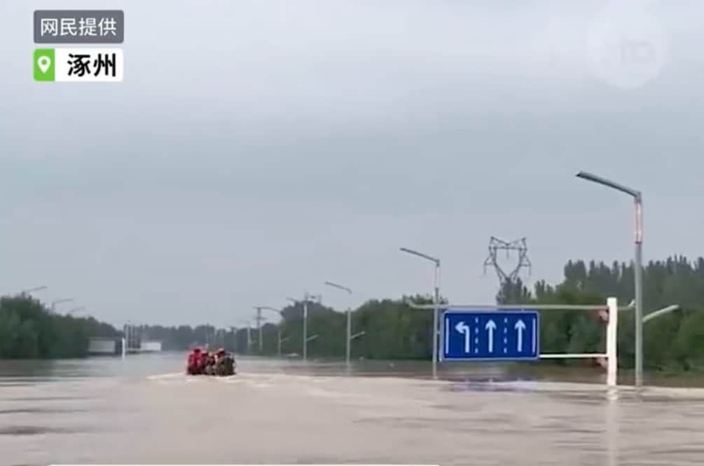 Một đại lộ ở Trác Châu, tỉnh Hà Bắc, bị ngập gần đến gần biển báo, nhân viên cứu hộ cho biết nước sâu đến 7 - 8 mét (Ảnh chụp màn hình video)