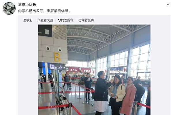 Một cư dân mạng khác cho biết: “Tại sảnh khởi hành sân bay Nội Mông, mọi hành khách phải đo nhiệt độ cơ thể”, kèm theo hình ảnh liên quan.