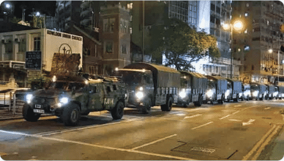 Nhiều xe quân sự của ĐCSTQ xuất hiện trên đường phố Hồng Kông vào sáng sớm ngày 25/6. (Ảnh từ Twitter).