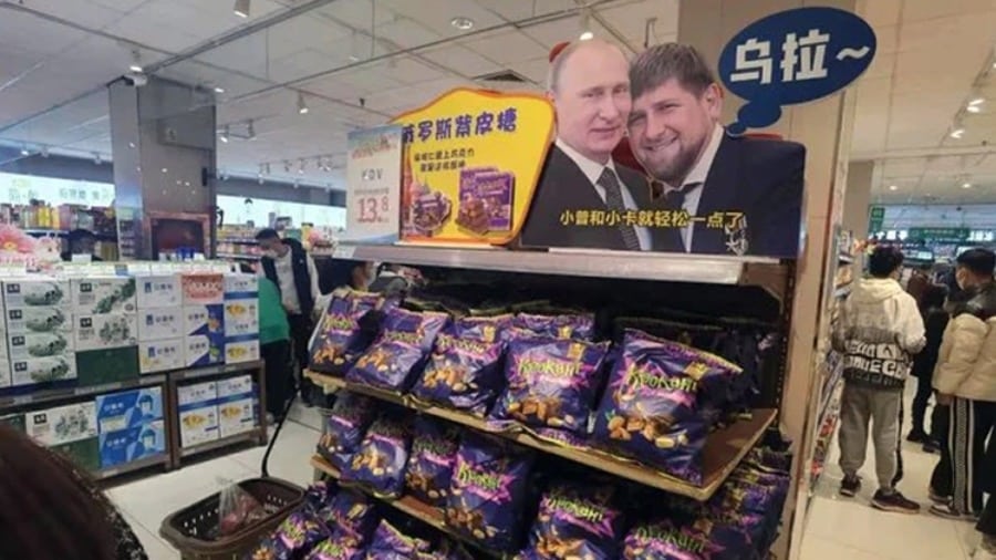 Cách đây vài ngày, để quảng cáo kẹo Nga, các trung tâm mua sắm Trung Quốc đã trưng bày ảnh chụp trực diện Tổng thống Nga Vladimir Putin và nhà lãnh đạo Nước Cộng Hòa Chechnya, ông Kadyrov, để kêu gọi mua kẹo Nga.