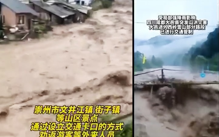 Trùng Khánh, nằm ở khu vực đồi núi, có thể nhìn ra những ngọn núi và vùng nông thôn xung quanh. Thành phố này liên tiếp đưa ra cảnh báo lũ quét trong 2 ngày liên tiếp. Lũ quét đã xảy ra ở 11 thành phố, gồm Thành Đô và Quảng Nguyên.