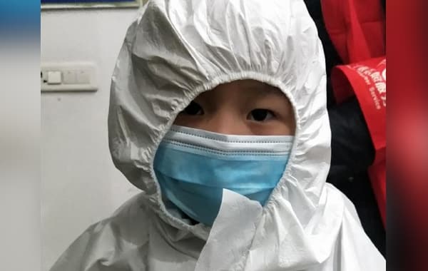 Bức ảnh từ hiện trường, cậu bé được mặc quần áo bảo hộ. Quần áo bảo hộ khoác lên người thấp bé của cậu, hơi rộng, mũ che một phần mắt của cậu.