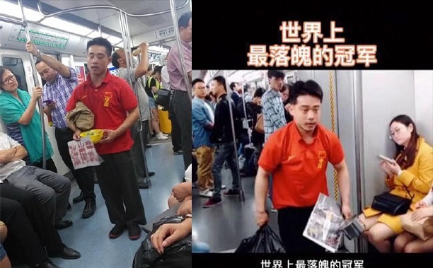 Gần đây, những bức ảnh của cựu quán quân thể dục dụng cụ Trung Quốc Trương Thượng Vũ (Zhang Shangwu) được lan truyền nóng trên Weibo. Trong bức ảnh, anh mặc đồng phục thể thao của đội tuyển quốc gia Trung Quốc ăn xin trong một toa tàu điện ngầm, trên tay còn cầm một tấm biển có tên mình.
