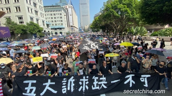 Ngày 20/10, người dân Hồng Kông tổ chức diễu hành “Xóa bỏ luật tà ác, điều tra độc lập, tái cơ cấu lực lượng cảnh sát” tại khu Cửu Long. Cuộc diễu hành bắt đầu lúc 1:30 chiều, từ Công viên Salisbury tại Tsim Sha Tsui diễu hành đến Trạm tàu cao tốc Tây Cửu Long. Khoảng hơn 350.000 người đã tham gia hoạt động lần này.Hơn 350.000 người Hồng Kông đã tham gia hoạt động diễu hành tại Cửu Long, để tiếp tục đưa ra 5 yêu cầu đối với chính phủ Hồng Kông cũng như lên án cảnh sát lạm dụng bạo lực và bắt người. (Ảnh: Secretchina)
