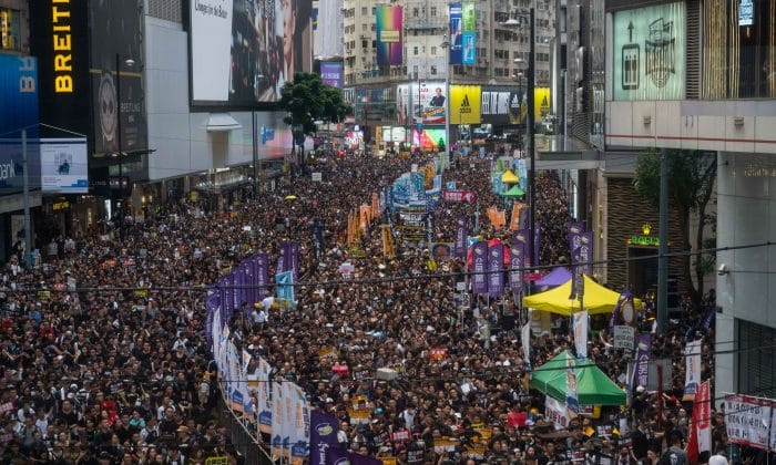 Vào sáng thứ Hai (1/7), bất chấp cái nóng ngột ngạt, hàng trăm nghìn người đã tuần hành từ Công viên Victoria tới trung tâm thành phố. Những người tham gia cuộc tuần hành hét lớn khẩu hiệu: “Carrie Lam từ chức, Rút lại luật xấu xa.”